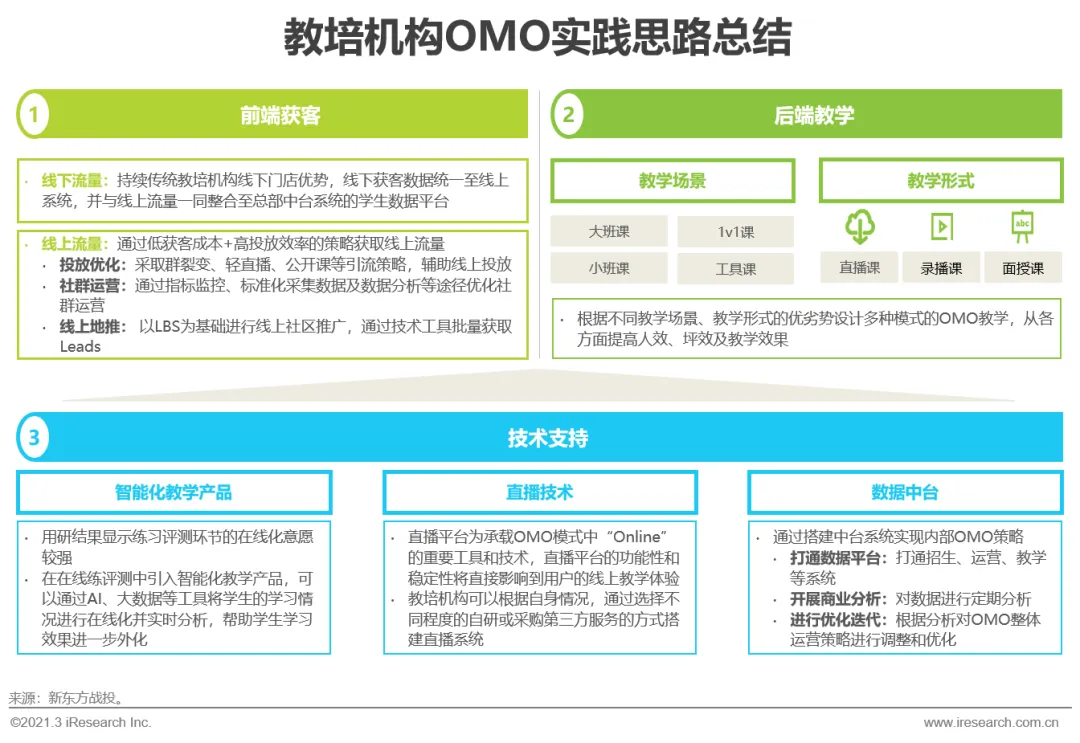 教育行业OMO模式是指通过科技革新及组织变革的方式对教育全链条进行重塑,进而实现线上线下融合的商业模式。OMO聚焦于效果及服务两大行业基石,通过模式创新的方式拓宽服务半径,提升教育效果,同时科技的融合为此提供了无限的想象空间。对于机构而言,OMO是实现产品差异化、降低获客成本及加深护城河的关键手段之一;OMO并没有明确的边界与范围,各家机构基于自身对科技及教育的理解,探索OMO模式下自身的解决方案。