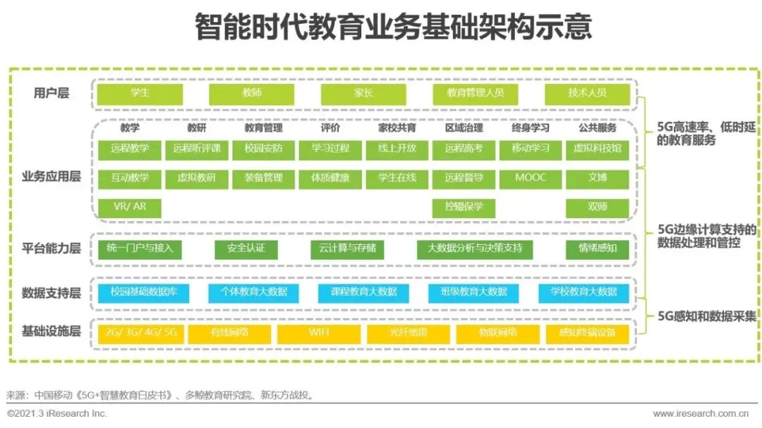 相比4G,5G在网络延时及可靠性、区域设备接入密度、平均网络带宽等方面做出了重大改进。在教育领域,5G将带来多项重大改变,一是大幅提升移动在线教育的互动性,5G网络下,直播视频可实现4k/8k超高清、低时延,实现实时课堂互动;二是推动线下教育模式的演变,5G网络下,万物互联,现有线下教室可被打造成智慧互联教室;三是模糊现有教学模式的边界,全面打通线上线下教学环节,打造教学体验闭环。基于5G,AI、AR/VR、大数据等技术有望进一步发挥潜能。5G+AI可以更好地实现个性化教学,在5G网络下,学生的学习行为可以被实时捕捉,形成完整的记录,再通过人工智能和大数据的深度分析,实现更高质量的自适应学习;5G+AR/VR可以改善课堂体验,现阶段基于移动端设备的计算、传输能力可以在云端实现,大幅减少设备体积,甚至实现可穿戴化,学生可以随时随地进行沉浸式学习,有利于提升教学效果。