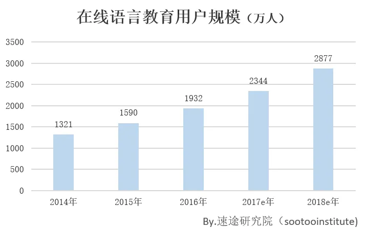语言教育的特质决定了其用户群体覆盖的广泛性,无论是学生、在职人员还是语言学习兴趣爱好者,无论处于什么年龄阶段,都对语言的学习具备一定需求,在线语言教育市场用户基数较大。数据显示2014年在线语言教育用户规模为1321万人,2016年增长至1932万人,预计2017年将以20.8%的增长率增长至2344万人。
