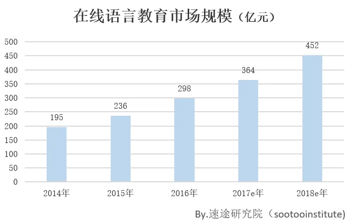 依托互联网的优势和人们对于语言学习重视程度的加深,在线语言教育发展势头强劲。数据显示,自2014年起至2016年底在线语言教育市场规模增加100多亿元,预计2017年在线语言教育市场规模将增长至364亿元,增长率为22.1%;而到了2018年,其市场规模将突破450亿元。在语言教育市场中,以英语教育最为火爆,为满足市场需求,各类在线英语教育平台不断崛起。