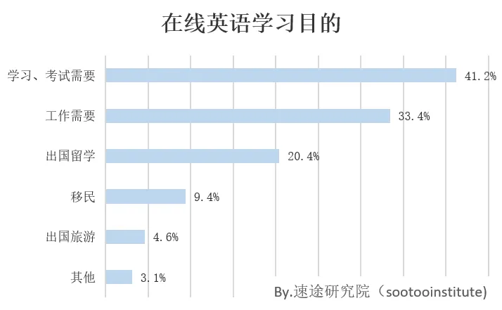 调查数据显示,41.2%的用户选择在线英语是为了辅助考试和学习,其中,K12成为在线英语教育的主要受众群体,另外受社会现状改变及新一代年轻父母教育理念的影响,少儿英语市场也相对火热。如今无论是对外商务沟通合作、就业还是职位晋升,英语的掌握程度都对此产生较大的影响,因此有33.4%的用户因为工作需要选择在线英语教育;出国留学、移民与出国旅游也是在线英语学习的主要目的,分别占比20.4%、4.6%和3.1%。