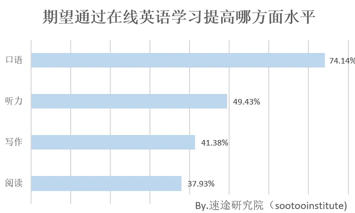 传统英语教育往往是为了应付考试,不少人在英语教育方面投入较多资金,最终结果却不尽理想。随着英语学习观念、目的的改变,学习者更注重实用性,尤其以成人英语教育为主,期望通过在线英语教育平台的学习,提高英语听、说能力。调查数据显示,74.14%的用户期望通过在线英语教育平台提高自身英语口语能力;49.43%的用户想提高英语听力能力。在此前提下,在线英语教育将会以口语培训作为主要发力点之一。