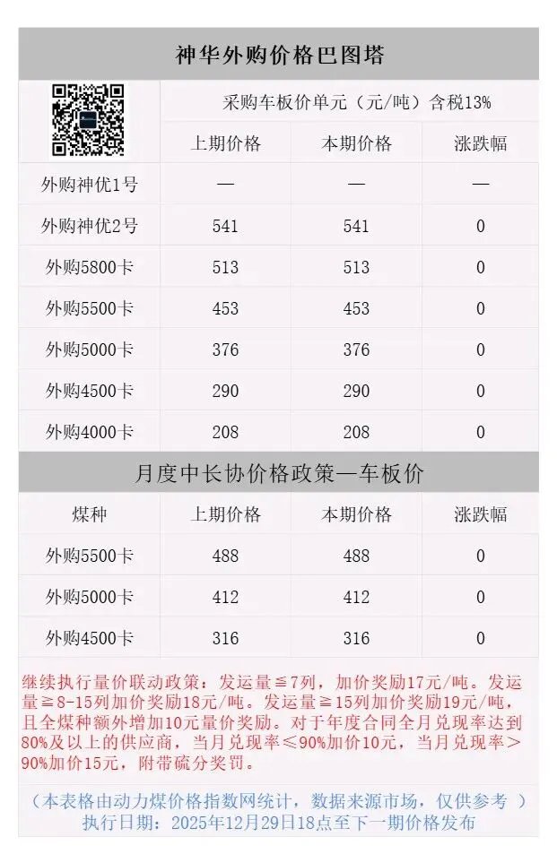 神华外购巴图塔采购政策量价奖励加10元,执行日期:2025年12月29日18点至下一期价格发布