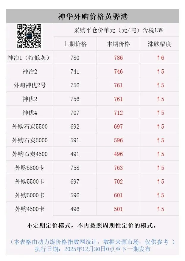 神华外购黄骅港上调5-6元,执行日期:2025年12月30日0点至下一期价格发布