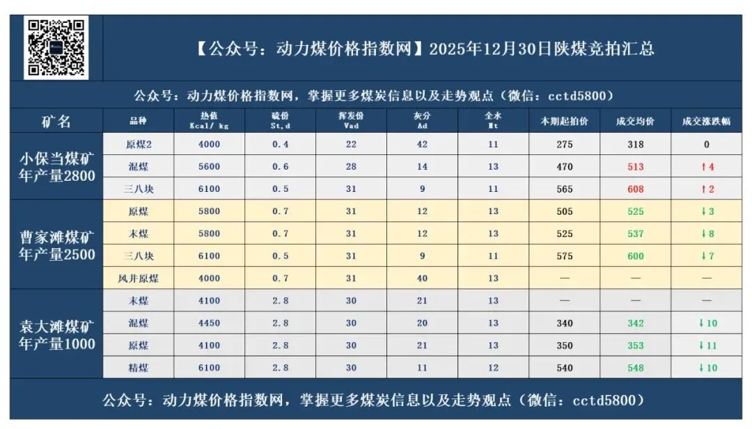 陕煤竞拍情况:12月30日陕煤成交价格汇总