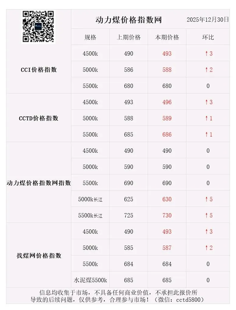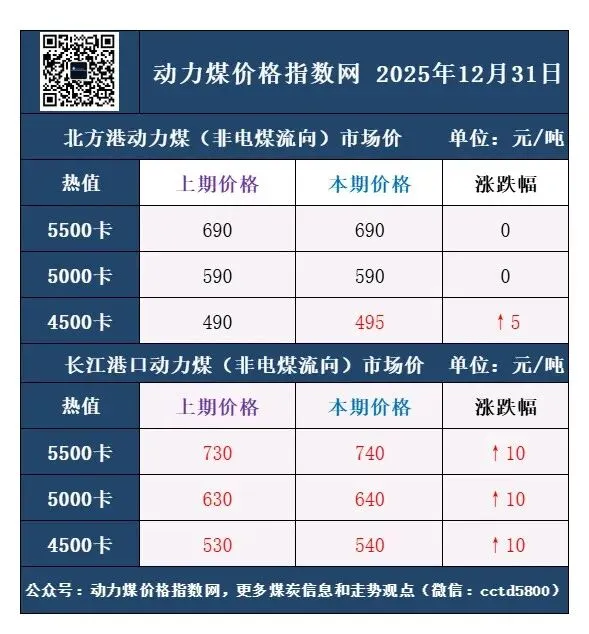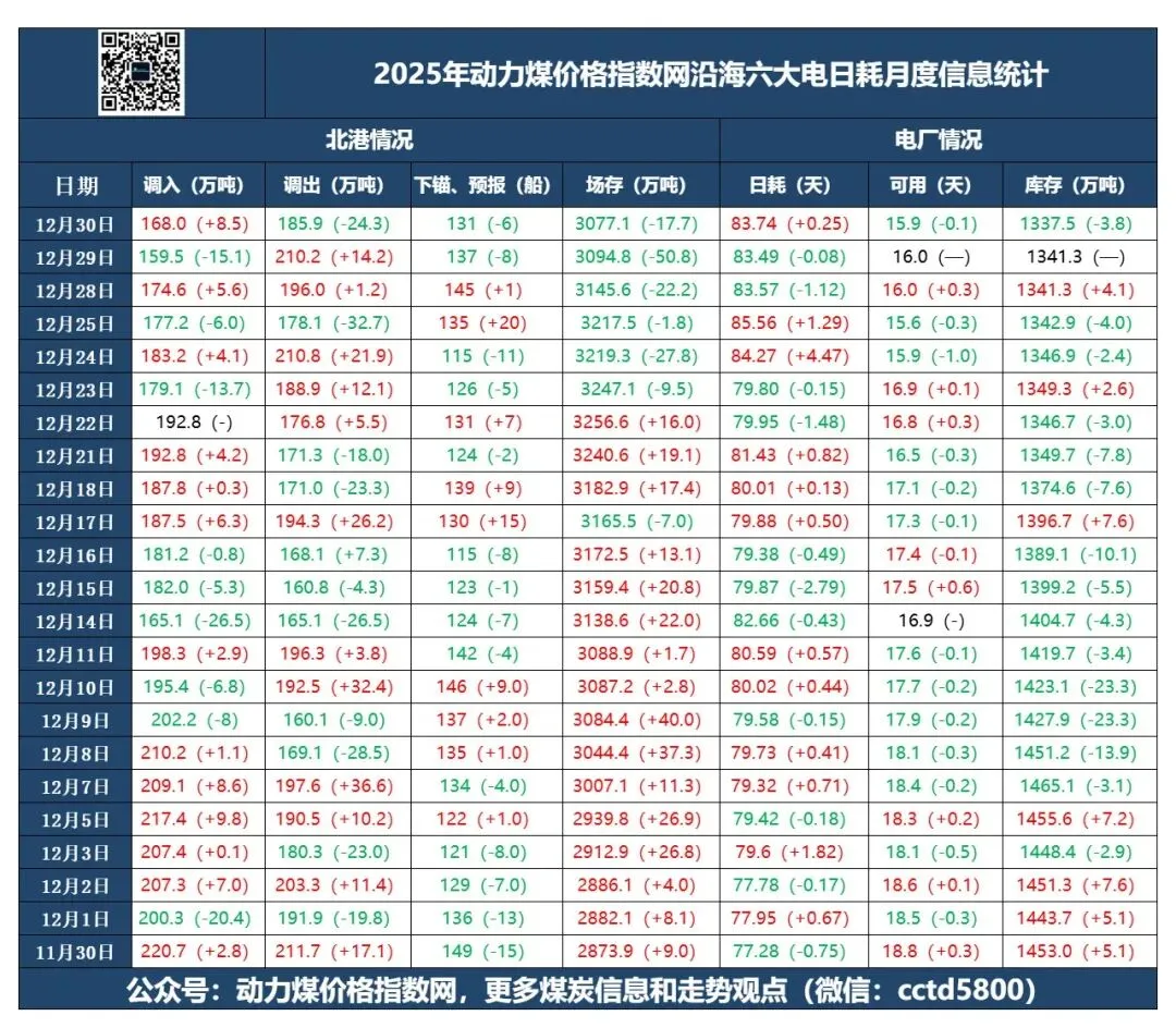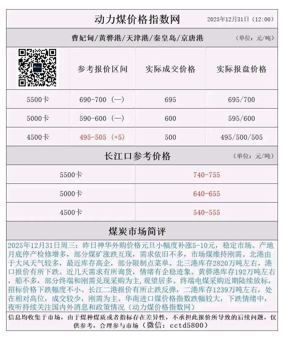 2025年12月31日周三:昨日神华外购价格元旦小幅度补涨5-10元,稳定市场。产地月底停产检修增多,部分煤矿涨跌互现,需求依旧不多,市场煤维持刚需。北港由于大风天气较多,最近库存高企,部分限制点菜单。北三港库存2820万吨左右,港口报价有所下跌。近几天需求有所询货,情绪有企稳迹象。黄骅港库存192万吨左右,船不多,部分终端和刚需兑现采购为主,观望居多。终端电煤采购近期陆续放标,招标价格下跌幅度不小。长江二港报价有所止跌反弹,二港库存1239万吨左右,处在相对高位,成交较少,刚需为主。华南进口煤价格指数跌幅较大,下跌情绪中,夜听持续关注国内外消息和政策情况(动力煤价格指数网)