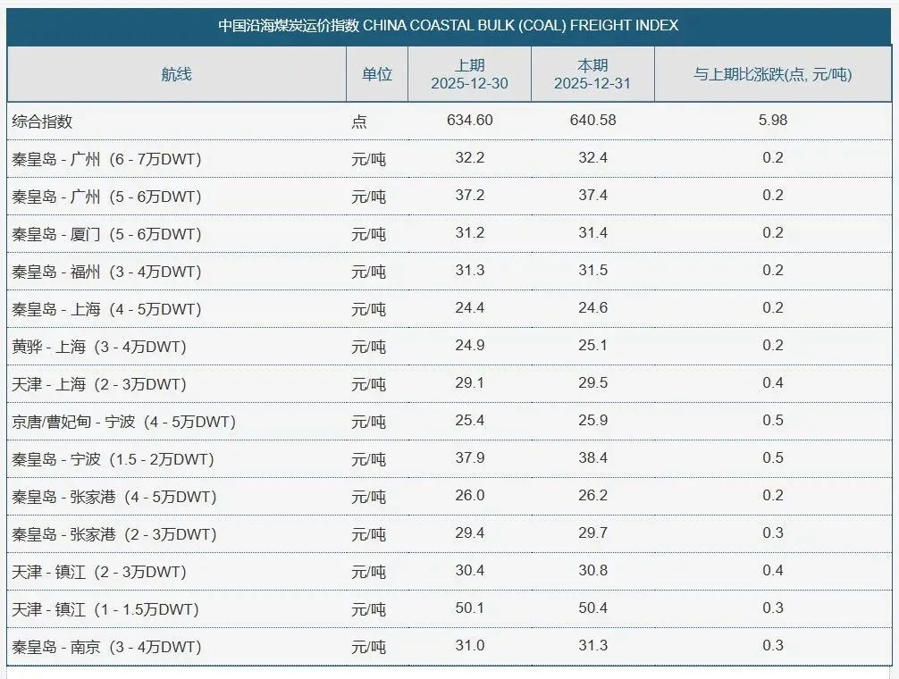 【煤炭海运费情况(2025年12月31日)】: