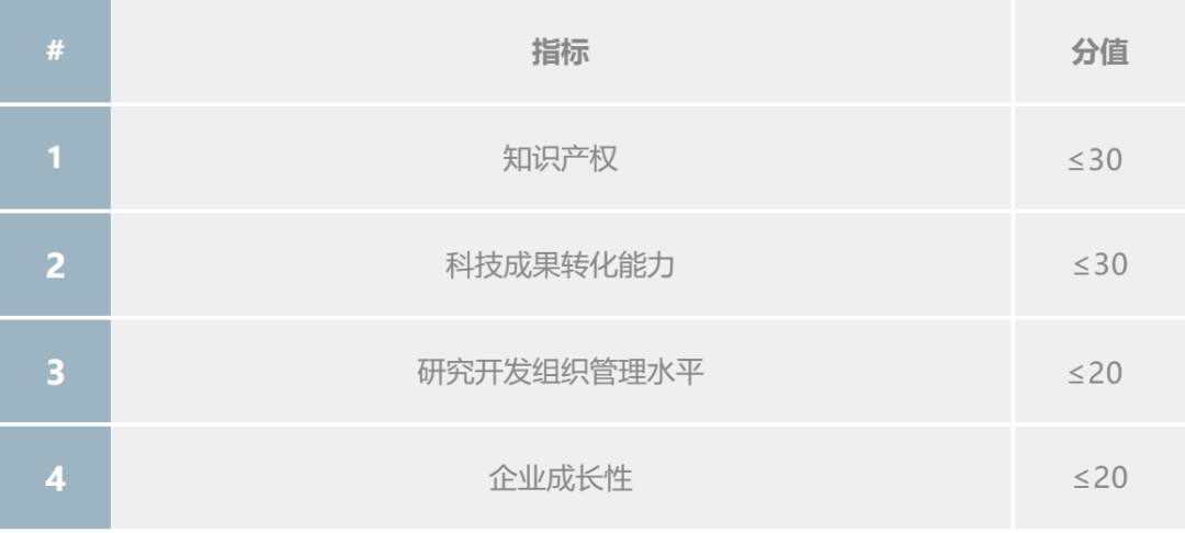 主要从知识产权、科技成果转化能力、研究开发组织管理水平、企业成长性等四项指标进行评价。各级指标均按整数打分,满分为100分,综合得分达到70分以上(不含70分)为符合认定要求。