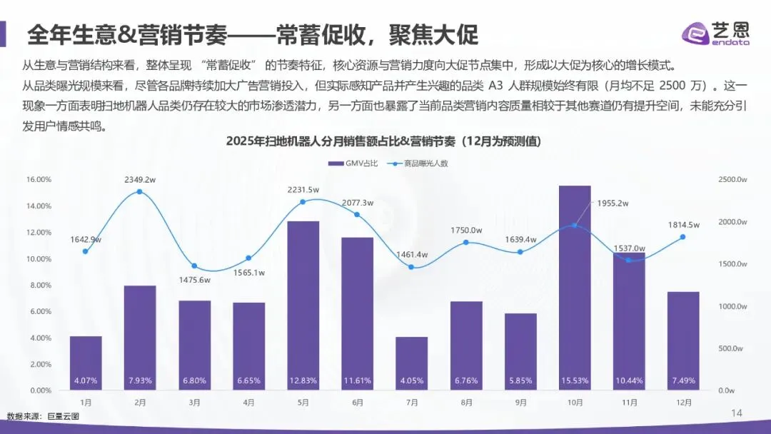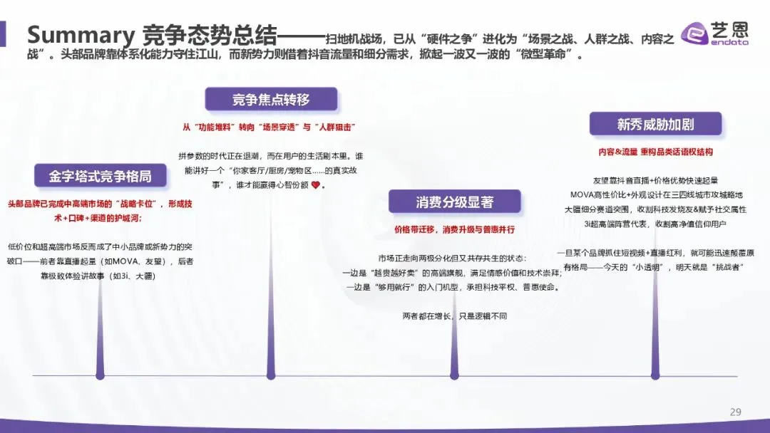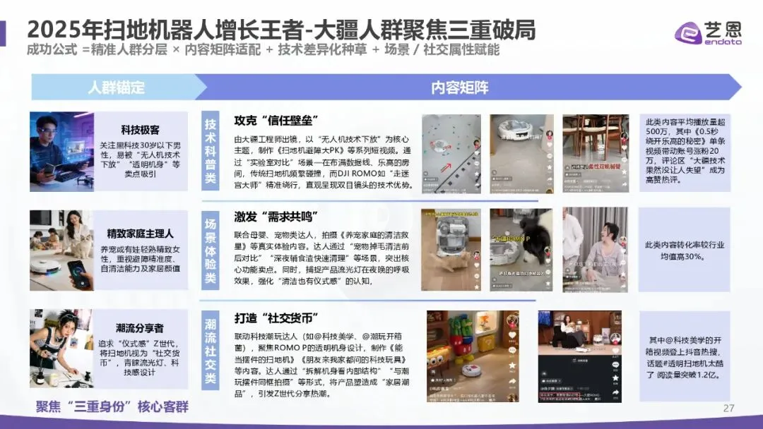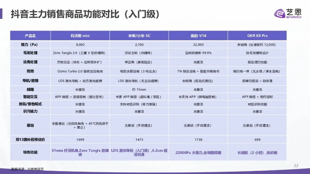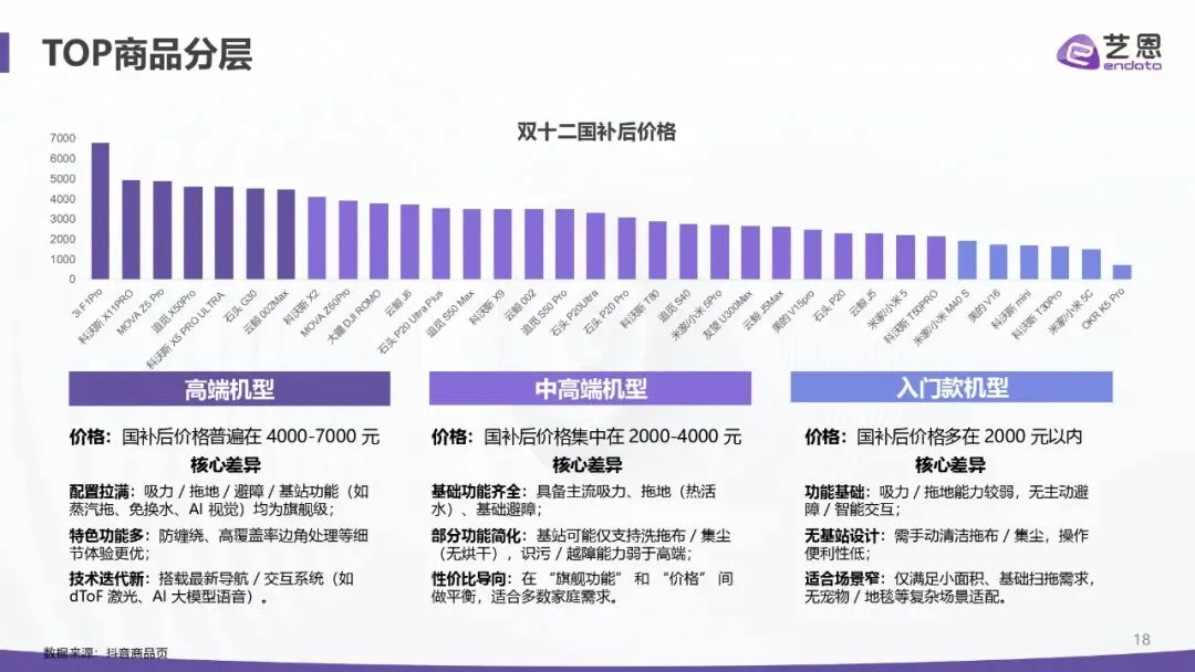增长强劲:2025 年 1-11 月抖音销售额超 52 亿元、同比 + 50.97%;全球前三季度出货 1742.4 万台、同比 + 18.7%,中国厂商包揽前五,石头以 21.7% 份额居首。 价格分层:中高端(3k-8k 元)为头部主场,科沃斯、石头、追觅主导;超高端(8k 元以上)由戴森等布局;低端市场中小品牌混战。 竞争焦点:从吸力 / 续航转向 “智能认知 + 清洁精度 + 体验闭环”,基站功能与 AI 能力成溢价核心。