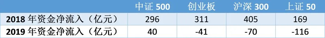 当然,以上判断偶尔也有例外的情况,还要结合分时成交量分布情况来做具体判断。另一方面,ETF还能反映资金的中期趋势。下面这张表是2018年以来,全市场中证500ETF、创业板ETF、沪深300ETF的资金流入情况: