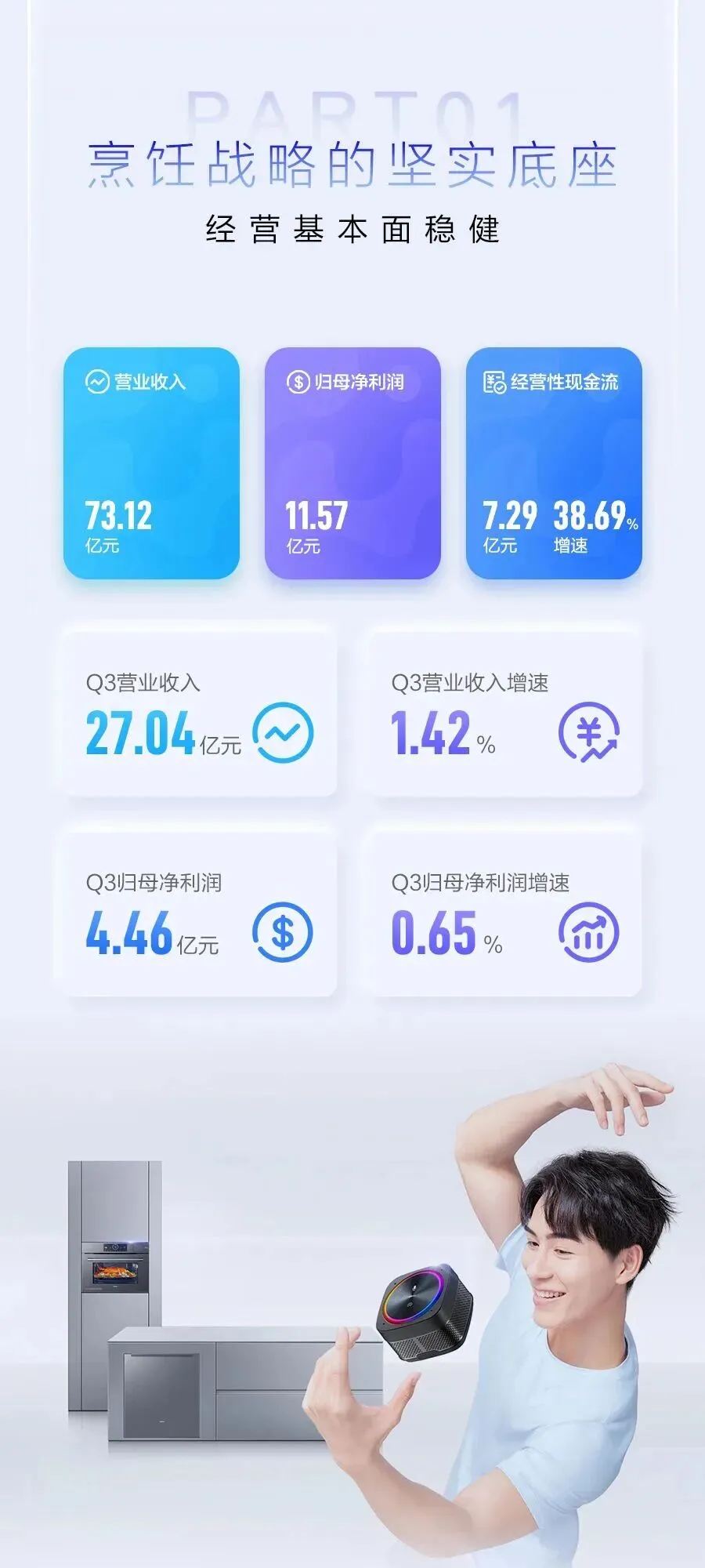 10月29日晚,老板电器披露的2025年第三季度业绩报告显示,公司前三季度实现总营收73.12亿元,归母净利润11.57亿,经营活动产生的现金流量净额7.29亿,增速38.69%;其中,三季度单季度营业收入27.04亿元,同比增长1.42%,归母净利润4.46亿,增速0.65%。