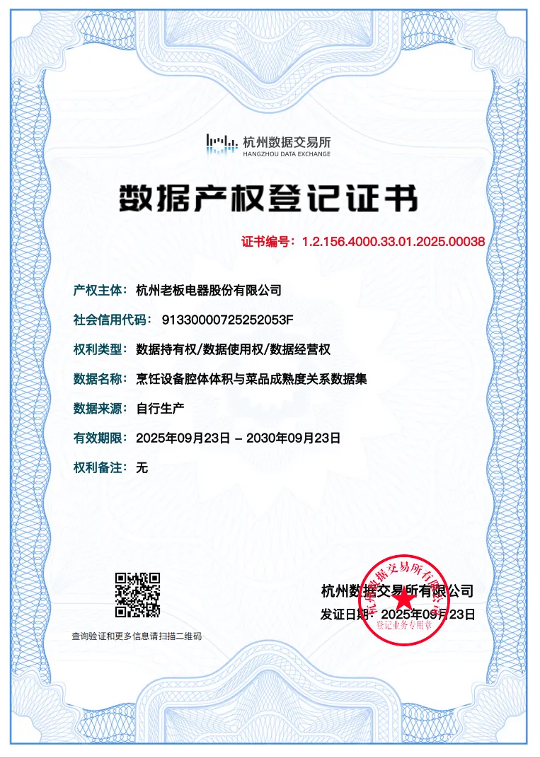 数据层面,企业一举获批7张数据产权登记证书,成为厨电行业首个实现数据持有权、使用权、经营权“三权合一”的企业,《厨电行业高质量数据集建设》项目既入选国家首批15个高质量数据集建设先行先试单位,又跻身浙江省级典型案例(全省仅16家),46年积淀的烹饪数据通过规范化运营持续赋能模型进化,实现从通用智能到个性化服务的升级。
