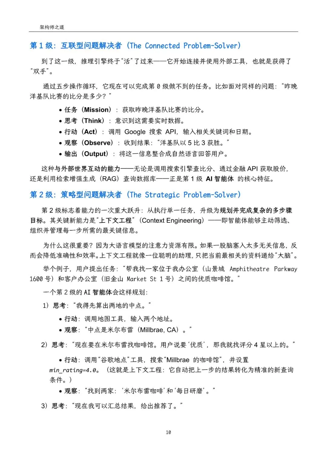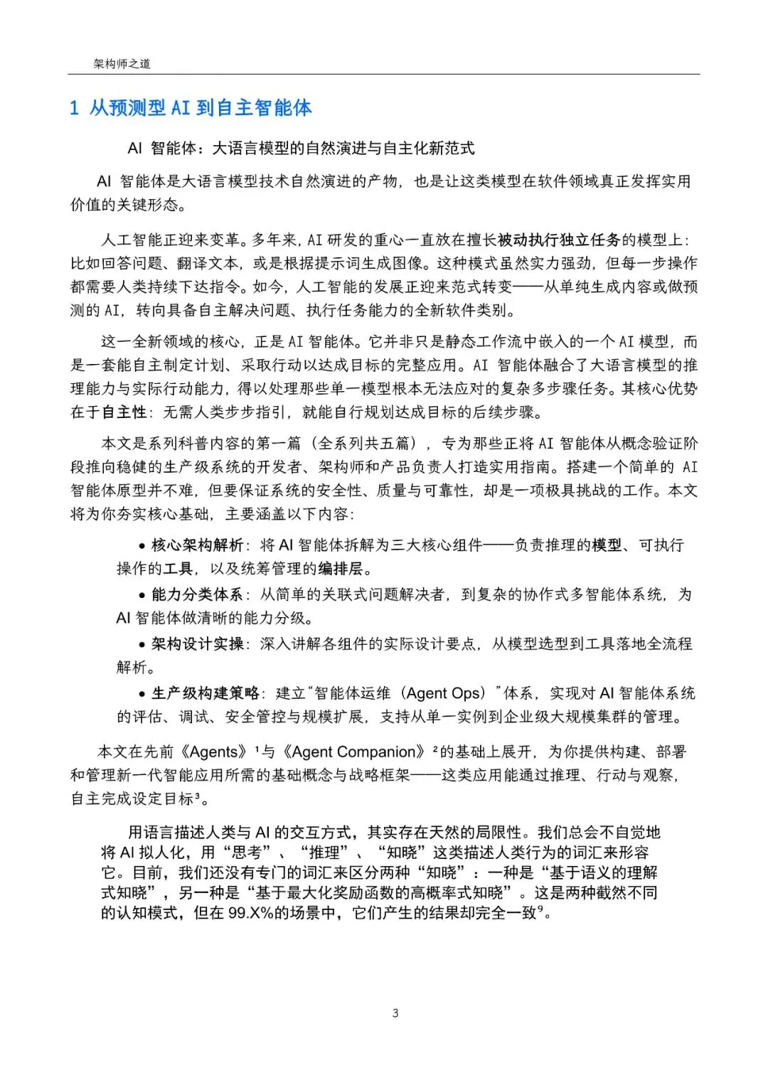 白皮书开篇即指出,AI智能体(AI Agents)是一种能够通过观察环境、使用工具、执行动作以实现特定目标的自主程序。相较于传统的大型语言模型(LLM),智能体不仅具备强大的文本生成与理解能力,更在推理、规划与自主行动方面展现出显著优势。它们能够主动拆解目标、调用工具、闭环完成任务,从而在复杂多变的现实场景中发挥巨大作用。