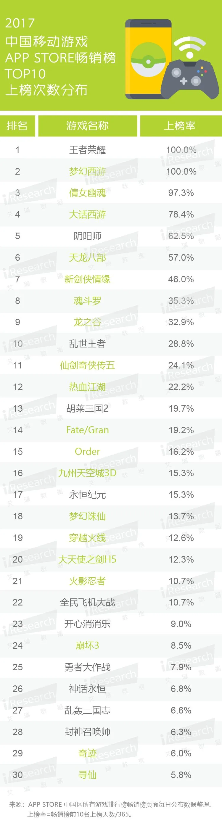 ▌2017年中国移动游戏畅销TOP30
