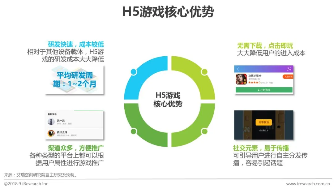 自从2014年的爆红游戏《围住神经猫》之后,H5游戏的社交元素和吸量能力一直是毋庸置疑的。在不断的探索和尝试中,于2017年10月,产生了第一个月流水过亿的产品。2017年底,微信小游戏的上线,更是将H5游戏的话题推至风口浪尖。纵观其发展历史,核心技术在不断提升,专门针对H5游戏研发的引擎几近成熟;早期的游戏类型多为玩法单一的休闲益智,而如今已有多款高质量精品化的重度游戏上线;商业模式也从最基础的内嵌广告转为了变现能力较强的道具付费。2018年将会是H5游戏真正的拐点,产品、用户、入口等多方都在不断升级,市场的潜力终究会爆发出来。