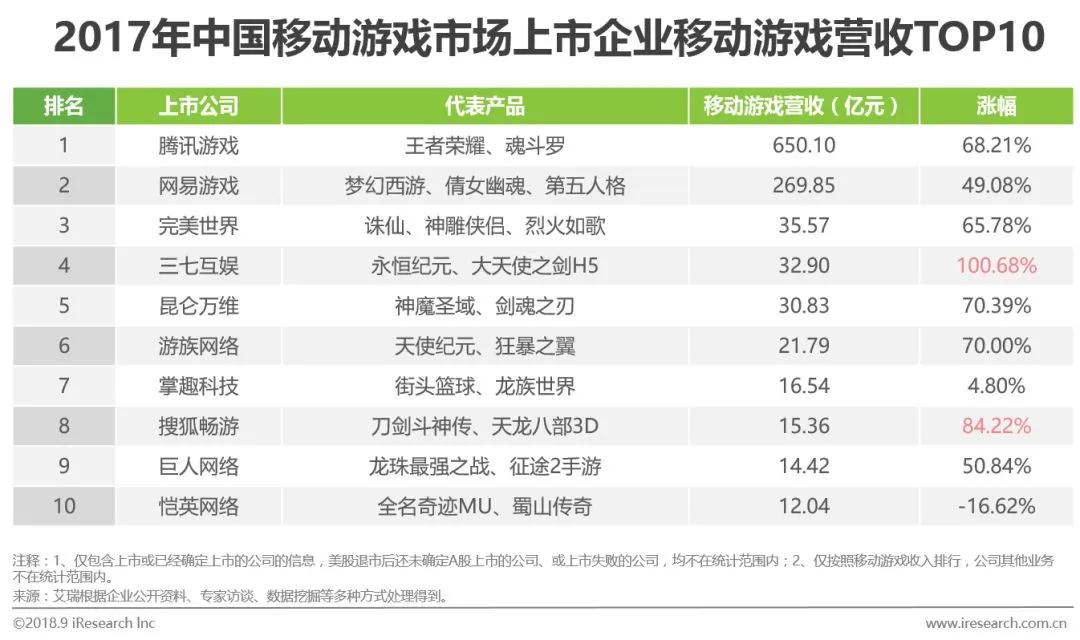 在网易、腾讯两家超级巨头企业的挤压之下,第二梯队的竞争显得尤为激烈,进入榜单的门槛已抬高至12亿元。多数企业均有不同程度的上涨,其中三七互娱获最高涨幅,最终反超昆仑万维排名第四;而搜狐畅游依靠着84.22%的涨幅,成功冲入榜单排名第八。