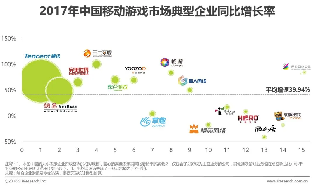 腾讯、网易、完美世界不仅依然在体量上保持前3的排名,在增长率上同样居高不下。而整体来看,没有如同去年一般,出现了3家近2倍增长率的亮眼表现,今年最高的增长率不过100%,平均增速也下降了1/3。其中10至14名的企业皆有不同程度的下跌。2017年移动游戏市场的变化极快,从年初的王者荣耀、年中的IO类游戏、一直到年末的大逃杀类游戏,只有不断抓住重点迅速行动的厂商,才能始终紧跟时代步伐。