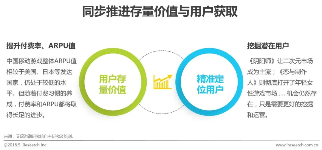 依靠买量获取用户并转化为收益的模式已日渐式微,所有的厂商都开始关注用户的存量价值,将提升APRU值作为未来的市场规模提升的主要方向,这符合“流水=玩家数量 x 付费率 x ARPU值”的标准公式。但游戏是多元化产业,《王者荣耀》《旅行青蛙》等爆款游戏,让广大的游戏从业者看到用户增量仍然存在,只是需要更加精准化、跨界化、感性化的进行用户定位。唯有在用户的获取和运营上同步推进,才能将整体价值提升至最大化。