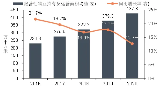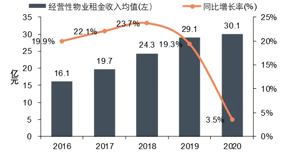 ▌经营性物业持有及运营规模增长放缓,增速回落至12.7% 图 商业地产百强代表企业经营性物业持有及运营面积均值及增速疫情影响下,商业地产百强代表企业经营性物业持有及运营规模增长放缓。2020年,商业地产百强代表企业经营性物业持有及运营面积均值为427.3万平方米,同比增长12.7%,增幅较2019年收窄5.0个百分点。▌疫情影响下,租金减免措施导致百强代表企业经营性物业租金收入同比仅增3.5% 受新冠肺炎疫情影响,部分商业地产企业经营情况受到冲击,多数企业携手商户共克时艰,积极实施租金减免等纾困措施,用阶段性的租金收入减少换取租户稳定续租,减少后续空置风险。图 商业地产百强代表企业经营性物业租金收入均值及同比增速2020年,百强代表企业经营性物业租金收入均值为30.1亿元,同比小幅增长3.5%,增幅较2019年收窄15.8个百分点。2020年,商业地产行业的困境资产整合以及企业间的合作与整合不断出现。一方面,凭借强大的资金实力与品牌影响力,头部企业通过收并购行为以较低成本实现业务规模增长;另一方面,部分处于困境中的中小企业通过出售优质资产换取生存机会。预计未来,商业地产行业格局将继续加速分化,行业集中度有望进一步提高。▌300城商办用地成交规模平稳增长,代表企业拿地放缓,投资聚焦二线城市,三四线城市占比显著下降经过过去几年商办用地的大量供应,尤其是部分三四线城市商办用地供应较多,形成大量商业供应,但多数三四线城市消费及办公需求较一二线城市存在较大差距,导致商业空置率高企,造成企业经营风险。近几年,头部房企拿地态度趋于谨慎,三四线城市拿地占比显著回落。图 2016-2020年300城商办用地推出及成交规划建筑面积2020年全国商办用地推出及成交规模同比均增长。2020年,全国300城商办用地推出规划建面3.05亿平方米,同比增长1.2%,商办用地成交规划建面2.54亿平方米,同比增长7.7%。