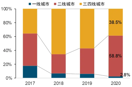 图 2016-2020年300城商办用地各线城市成交规划建筑面积从各线城市来看:2020年,受低基数影响,一线城市商办用地成交规划建面同比增长87.0%;二线城市成交规划建面同比增长7.8%,保持平稳增长;三四线城市商办用地成交面积同比增长3.5%,增长放缓。图 商业地产百强代表企业新增商办用地分布(按规划建筑面积统计)从新增商办用地分布看,百强代表企业在二线城市的新增纯商办用地比重持续扩大,2020年达到58.8%,金茂、宝龙等企业在二线城市纯商办土储持续增长。同时,百强代表企业在三四线城市的新增商办用地规模大幅减小,比重降低至38.5%。 ▌轻资产管理输出为企业储备优质项目,成为头部企业规模扩张的重要途径商业地产企业的轻资产化实质是企业从赚取资产升值收益走向赚取增值服务收益。轻资产模式已经成为商业地产头部企业储备优质项目、实现规模扩张的重要途径。预计头部企业的轻资产化将带来整个行业的集中度进一步提高。部分以轻资产运营模式为主的企业凭借其久经市场检验的运营管理能力,已经实现通过轻资产进行运营管理和品牌输出。而过去以开发和运营并重的商业地产企业,基于其丰富的开发运营经验以及强大的品牌影响力,近年来逐渐加强轻资产管理能力输出。▌百强代表企业重点项目平均出租率下滑至91.2%,但整体运营平稳2020年,商业地产百强代表企业重点项目平均出租率为91.2%,较2019年小幅下降1.9个百分点,整体仍处于较高水平。其中,各代表企业重点项目的平均出租率有所差异,万达广场、吾悦广场整体出租率仍保持在95%以上的较高水平,宝龙一城、宝龙城等项目整体出租率亦保持在90%以上,但亦有部分企业代表项目整体出租率降至90%以下。▌商业经营:数字化平台提升企业运营效率,头部企业依托强大号召力,加强品牌库建设提高招商能力如今,消费者更加注重消费的满足感与消费质量的提升,消费内容从有形商品向服务消费转变。百强代表企业积极应对市场变化,一方面通过搭建数字化运营平台,实现企业和项目的数字化管理,提升运营效率;同时通过微信小程序、直播平台等方式拓展线上运营渠道,挖掘创新消费场景,与线下实体商业联动,形成营销闭环,提升获客能力;另一方面,头部企业依托自身强大的号召力,持续与优质品牌建立稳定合作关系,并着力推动品牌库建设,提升招商能力,保障商业项目稳定运营。