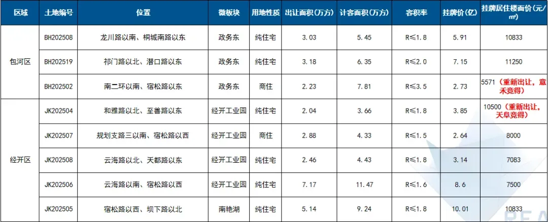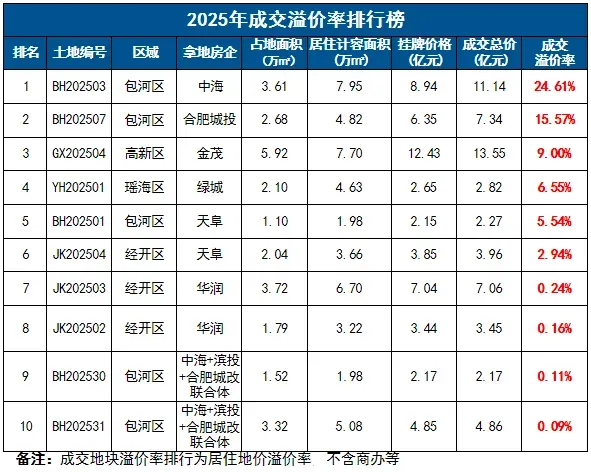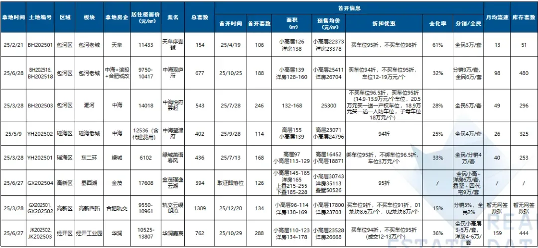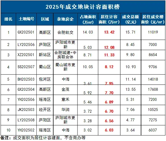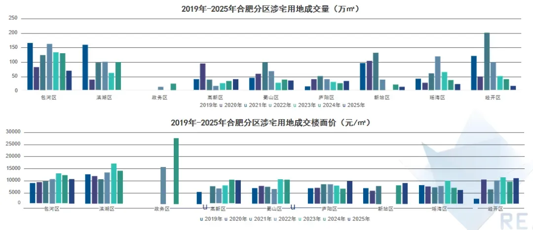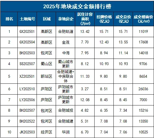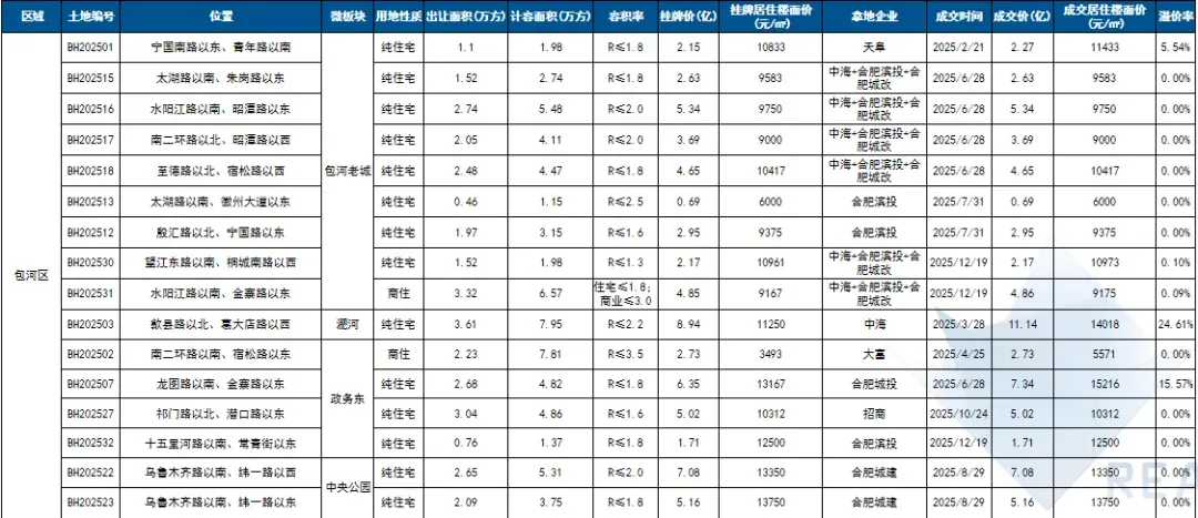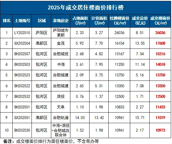 2025年庐阳城更LY202510、金茂高新GX202504、合肥城投包河BH202507地块成交楼面价位居全市前三;高楼面价成交地块集中于环城公园板块、蜀西湖板块等。