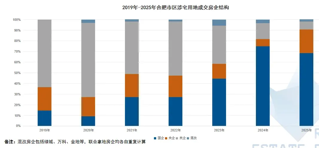 2025年,合肥土地市场参与主体结构呈现显著调整。受中海、招商、华润等大型央企积极参与的推动,央企在本年度土地成交中的占比达到22%,较上年同期提升15个百分点。与此同时,民营企业拿地占比收缩至7%,同比下降8个百分点,反映其投资意愿与能力均有所减弱。地方国有企业全年拿地占比为69%,虽同比小幅下降6个百分点,但仍占据市场主导地位。
