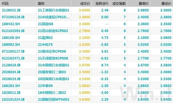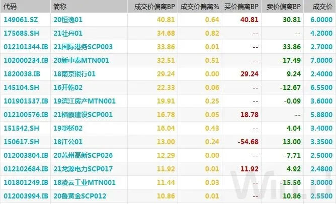 此外,“16青国投MTN001”跌超13%,“19伊泰03”跌10%,“19中化EB”跌超5%,“17明诚01”、“20江滨02”、“PR张掖债”均跌超4%;“20阳煤01”涨超24%,“19中国华融债01(品种一)”涨近14%,“20晋煤MTN011”涨超6%,“20桂建工MTN001”和“PR德投债”涨超4%。