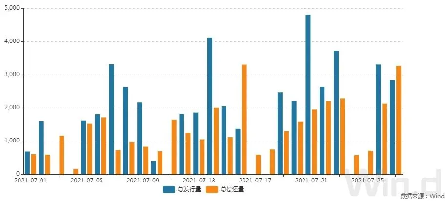 7月27日,债券市场共发行242只债券,总发行量2831.80亿元,155只债券到期,24只债券提前兑付,1只债券回售,无债券赎回,总偿还量3265.06亿元,当日净融资额为-433.25亿元。