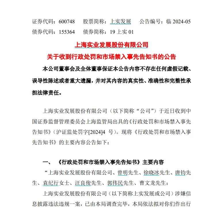 3月18日晚间,上实发展发布公告称,公司于近日收到上海证监局出具的《行政处罚和市场禁入事先告知书》。