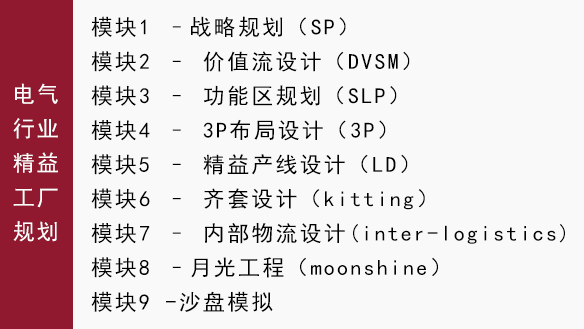 精益新工厂设计从流程上内置消除浪费,在新工厂设计阶段导入精益思想和工具,设计和建造一个精益新工厂。结合电气行业的痛点,我们规划设计了针对电气行业的精益新工厂设计方法和体系。