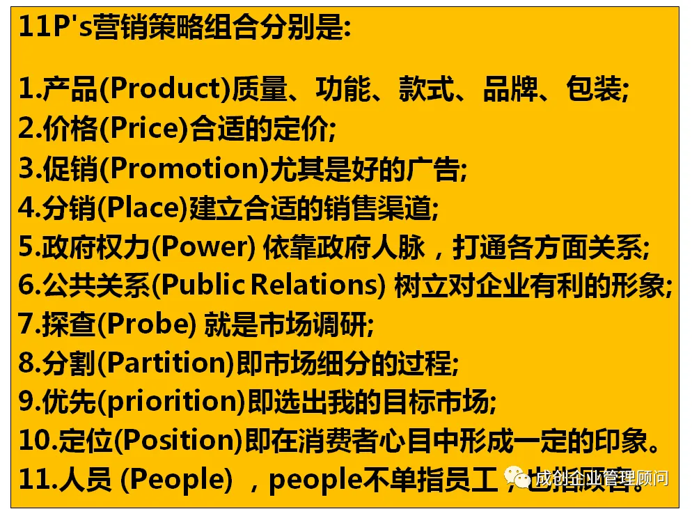 1986年6月,美国著名市场营销学家菲利浦·科特勒教授又提出了11P营销理念,即在大营销6P之外加上探查、分割、优先、定位和人,并将产品、定价、渠道、促销称为"战术4P",将探查、分割、优先、定位称为"战略4P"。该理论认为,企业在"战术4P"和"战略4P"的支撑下,运用"权力"和"公共关系"这2P,可以排除通往目标市场的各种障碍。