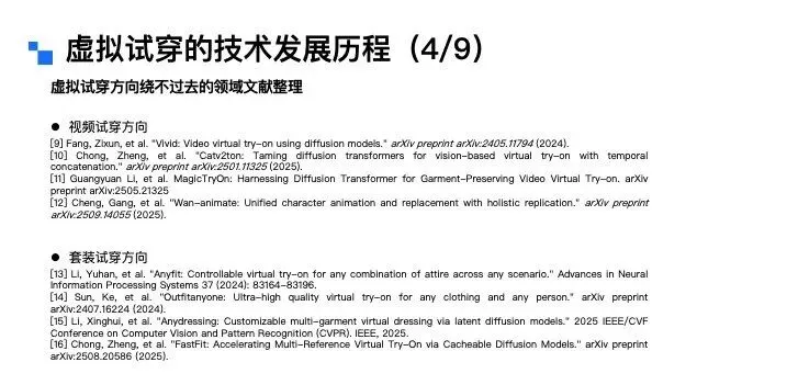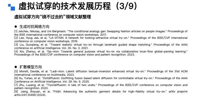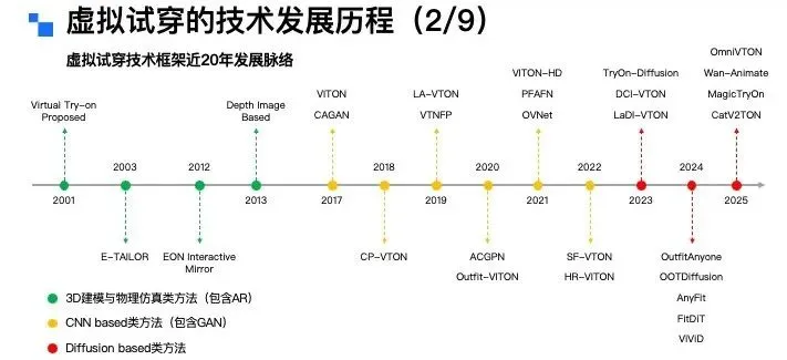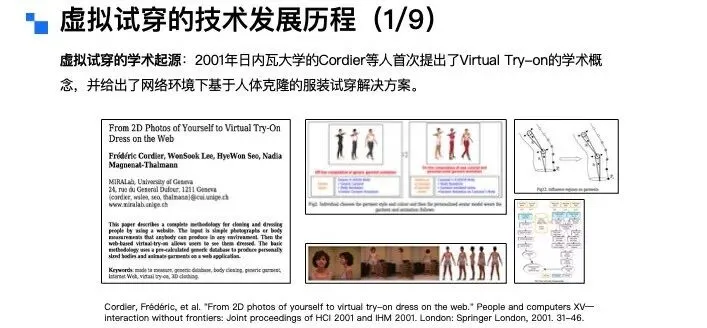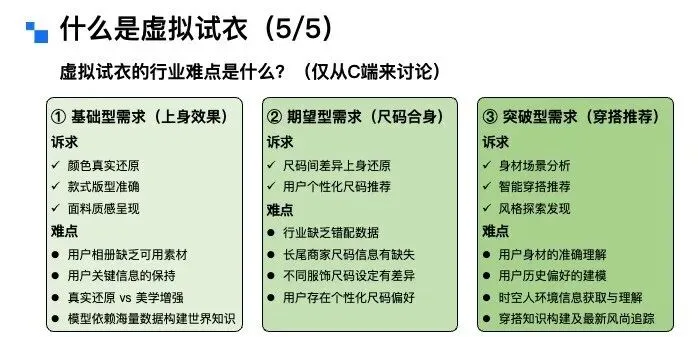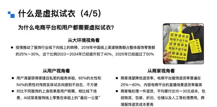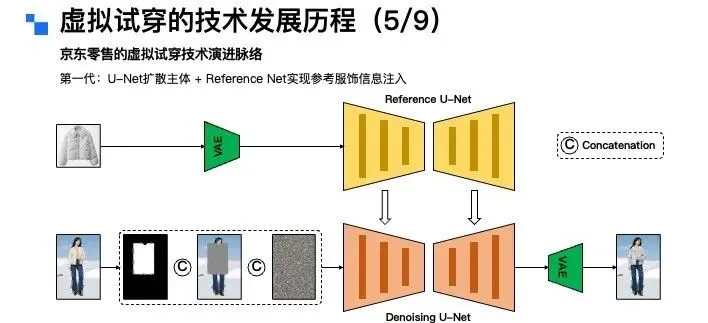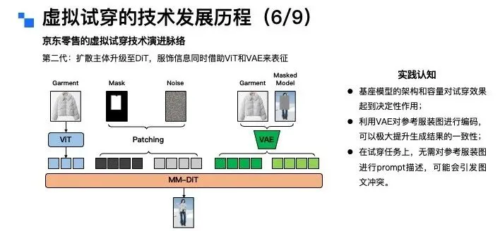 接下来,换个角度,从模特的视角来拆解虚拟试衣的分类。从模特类型来看,可分为全身模特、半身模特、多人模特以及视频模特;从输出形态来看,则可以分为静态图像模特和动态视频模特两类。讲到这里大家不难发现,虚拟试衣任务的输入条件其实是相当丰富且复杂的。因此,一个优质的虚拟试穿算法,需要对上述所有的组合矩阵都具备良好的适配能力。而截至目前,要实现这一点,依然存在不小的技术挑战。虚拟试穿技术的推进源于行业发展、消费者需求与商家痛点三大核心诉求,具体可从三个视角展开:从行业大环境来看,三年疫情直接推动服饰行业从线下向线上转移。2019年中国服饰线上销售额占整体零售额的25%~30%,2023~2024年这一比例提升至40%,2025年更是突破50%,线上购衣已成为主流消费习惯。从消费者视角来看,购物的便捷性和私密性需求日益凸显。调研数据显示,65%的女性和54%的男性对传统实体试衣间感到不自在、不方便——狭小空间内的脱衣穿衣操作、冬季厚重衣物的繁琐试穿流程,以及公共区域的疾病交叉感染风险等,均降低了线下试衣体验。而用户天然存在查看服装上身效果的需求,因此AI试穿被视为服饰线上零售在体验上的“最后一公里”。从商家视角来看,高退货率是服饰电商的核心痛点。这里有一张图,可能经常网购的女生会了解这个梗,现在有不少买家会做“穿完即退”的操作,尤其是礼服类服饰,穿着新衣服拍照打卡、出席活动后,就无理由退货,导致衣服沾染污渍异味,商家根本无法二次销售。为此,商家想出了用“大尺寸+硬质材料”的“巨型吊牌”,来对这种恶意退货进行物理防御。抛开这个梗不谈,普通电商平台的服饰退货率普遍在25%~60%,内容电商直播场景的退货率更高,部分可达80%~90%。商家每处理一件退货,平均需付出15~30元成本,涵盖物流、包装、折旧、仓储及人工处理等环节,跨境电商业务的成本则更高。此外,“穿完即退”等恶意退货行为也加剧了商家损失,因此行业亟需稳定、可靠的线上试穿技术与产品能力解决上述问题。虚拟试穿到底好不好做,行业的核心难点又在哪里?聚焦C端场景,虚拟试穿的核心难点集中在用户对技术的三层进阶预期,各层次需求对应的挑战各不相同:第一层是基础型需求,核心是服装上身效果的精准还原,包括颜色、款式、版型和面料质感。这一层面的难点主要有四:一是用户相册中往往缺乏直接可用的素材,尤其男性用户,难以提供合格的全身或头肩部位肖像;二是试衣算法需保证模特脸部等关键信息不被篡改,尤其是脸部特征,试穿前是什么样子,试穿后核心的面部ID信息必须保持一致,试穿前后核心面部ID信息保持一致;三是真实还原与美学增强的平衡“矛盾体”——算法初期优先追求信息还原,但女性用户对美观度诉求强烈,部分用户可接受轻微肖像修改以提升效果;四是试衣模型多基于扩散模型搭建,试穿效果依赖模型储备的世界知识。第二层是尺码合身需求,这是大众认知里,虚拟试穿最核心的刚需,也是目前实现难度最高的需求,行业内尚无成熟技术方案。从算法层面看,核心瓶颈是尺码错配训练数据的极度匮乏——电商平台买家秀多为合身尺码展示,缺乏“小体型穿大码”“大体型穿小码”等这类尺码mismatch的完整数据;此外,大量长尾服饰本身存在尺码信息缺失问题,不同品牌、品类的尺码标准不统一,这也是为什么有些店家会建议用户拍大一码或拍小一码。并且,用户对尺码存在个性化偏好,有人偏爱宽松的大码版型,有人则更倾向于合身的小码版型。所以说,尺码合身这个需求,是目前虚拟试穿技术实现中最大的难题,这进一步提升了实现难度。第三层是突破型需求,即基于用户身材与具体场景的智能穿搭推荐及个性化风格探索。这一层,用户的典型诉求是基于自身身材与具体场景,获得智能穿搭建议,甚至进行个性化的风格探索。比如:用户可以输入自身情况,提出“要参加朋友婚礼该怎么穿搭”“出席孩子家长会适合穿什么”这类场景化需求;也可以针对已有单品提问,比如“我有一件这个颜色的上衣,搭什么下装最合适”“这条裙子配哪种外套更好看”。这些都是用户在穿搭推荐上的典型诉求。这一需求的实现难点在于:一是模型必须精准理解用户的身材特征,避免推荐不符合体型的服饰,比如不能给体型偏胖的用户推荐短款显壮的衣服;二是做好用户历史偏好建模,准确捕捉用户过往的服饰品味,让推荐更贴合其个人喜好,不能给穿衣风格偏保守的用户推荐过多潮流品牌;三是需要获取并理解“时空人”信息,就像现在12月的北京已经入冬,天气寒冷,推荐时就应该优先考虑羽绒服这类御寒衣物。最后,既然要做风格探索,就必须持续投入穿搭知识库的构建,同时积极追踪最新的时尚潮流,这样才能给用户提供前沿且合适的穿搭建议。虚拟试穿的技术发展历程是什么?从虚拟试穿技术的发展看京东零售技术实践和未来发展方向。通过文献梳理可以发现虚拟试穿(Virtual Try On)的学术概念最早于2001年由日内瓦大学研究人员正式提出,这样早期研究给出了网络环境下基于人体克隆的服装试穿解决方案。采用高度定制化技术,需从特定角度对人体拍照取样,依赖流程化、模块化操作及关键节点定位技术,这就是虚拟试穿技术的学术开端。2001年至2025年的二十余年间,虚拟试穿技术在学术界的框架演进可分为