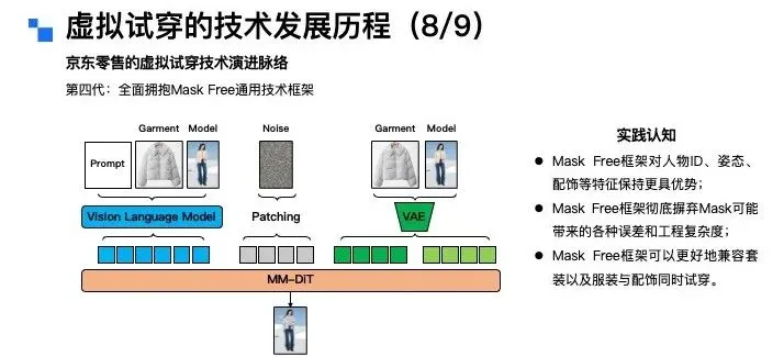 而京东零售最新的第四代虚拟试穿技术,这一代框架最显著的变化,就是完全摒弃了Mask模块,全面拥抱Mask Free的通用技术架构。与此同时,参考图的表征方式也从原来的纯视觉维度,进化为融合文本模态的多模态统一表征,这里我们引入了Vision Language Model 视觉语言模型来专门完成参考图的特征提取。基于第四代框架的实践,我们也沉淀了几个关键认知:第一,Mask Free框架对人物的身份特征、肢体姿态、服饰细节以及配饰元素,都能实现更好的保留效果;第二,该框架彻底摆脱了Mask模块可能带来的误差累积,同时大幅降低了工程研发的复杂度。毕竟从研发角度来说,系统模块越简洁,引入连带问题的概率就越低,而Mask模块本身会因不同应用场景产生各种badcase,容易引发新问题;第三,Mask Free框架可以更好地兼容套装试穿,以及服装与配饰的同步试穿需求。举个简单的例子:在传统Mask方案中,需要先mask掉用户原有的衣物,再叠加新服饰,可如果用户原本还斜挎着小包,这个包包大概率会随旧衣被mask掉,相当于破坏了用户的原始信息,而通过Mask Free的技术框架,就能实现“新衣上身,配饰保留”的效果。