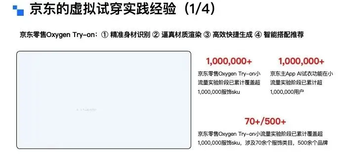 结合虚拟试穿技术发展历程和京东零售的技术实践,给正在做或将要做虚拟试穿的企业或相关产研人员建议,可总结以下核心观点:一是启动项目前一定要拿到最好的图像生成基座模型,因为模型的世界知识和基础能力,直接决定了整个项目的起跑线。请大家始终相信Scaling Law,至少在30B参数规模以内,这种效应的验证效果是非常清晰的。二是Mask Free技术框架会成为未来的主流方向,大道至简,越简洁的技术路线越正确,如果现在还有同学在Mask based方案里摸索,建议果断舍弃那些冗余的模块,尽快拥抱Mask Free的通用技术框架。三是从单件试穿到多件试穿是必然的技术趋势,而且必须要兼顾配饰。在我们看来,“试穿+穿搭”才是更具想象力的产品形态。我们现在聊的更多是“穿”的环节,但从产品层面来说,更关键的其实是“搭”的能力。四是试穿结果的视频化,是用户的核心诉求,这一点毋庸置疑。毕竟线下试衣时,大家都会对着镜子转身、摆动,动态效果才更贴近真实体验。但这需要我们长期攻克推理效率的难题,目前生成一段10秒的试穿视频,耗时基本还是分钟级,这样的速度对线上用户体验的影响是比较大的。五是数据的价值,用于试穿的训练数据,会成为各大电商平台的核心资产。极致的试穿效果,主要依赖于企业的in-house数据。我们都知道,数据是大模型的核心,虽然有些从业者为了凸显技术深度,会刻意回避甚至弱化数据的重要性,但事实就是如此。尤其是虚拟试穿这类赛道,每个企业都会建立自己的数据壁垒。同时,随着AIGC能力的提升,模型训练早期可以借助AIGC数据快速收敛到任务需求,后续再用真实数据校正,就能有效规避AIGC生成内容带来的失真。目前,京东零售的虚拟试衣能力还处于小流量测试阶段,现阶段产品已覆盖超百万服饰SKU,实验阶段用户量突破100万,覆盖70多个服饰类目,合作头部服饰品牌超500家。再给大家拆解一下具体功能,最左侧是商详主图的试穿入口。目前这个入口的设置比较保守,还在实验阶段,还是尽量避免影响用户原有的购物体验,后续会根据测试效果考虑提升入口优先级。