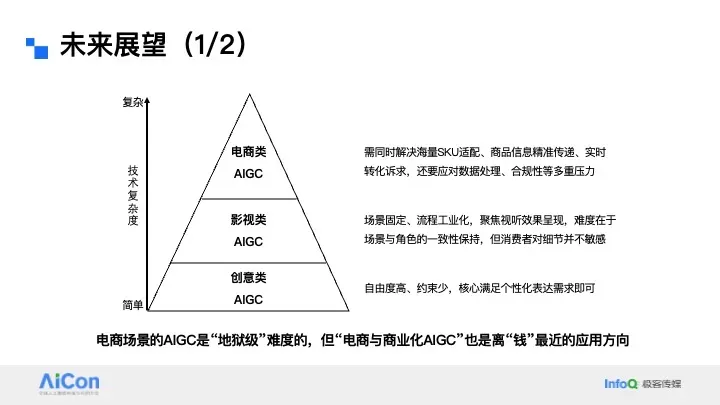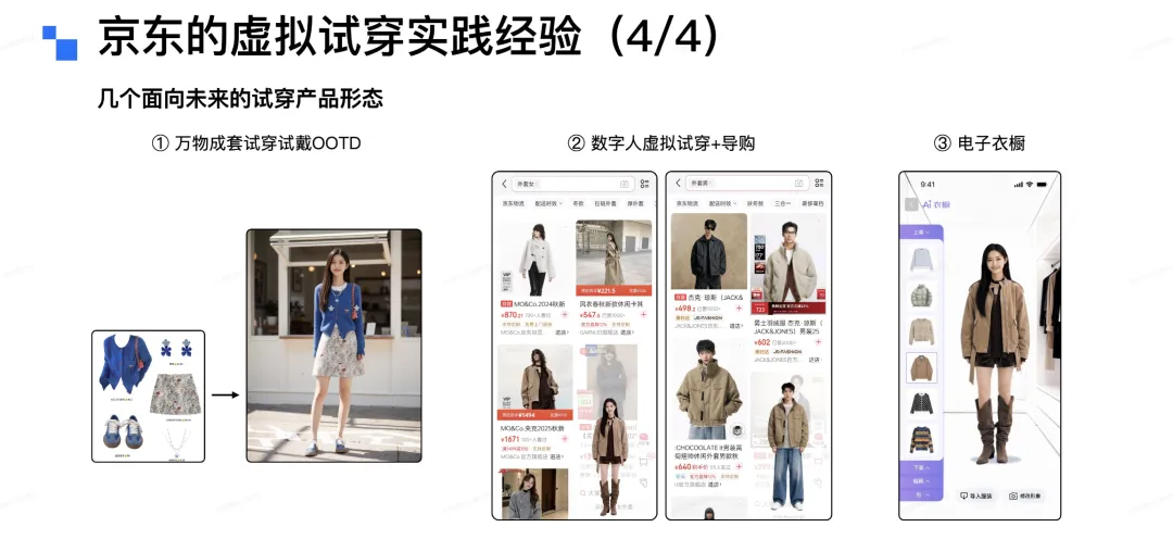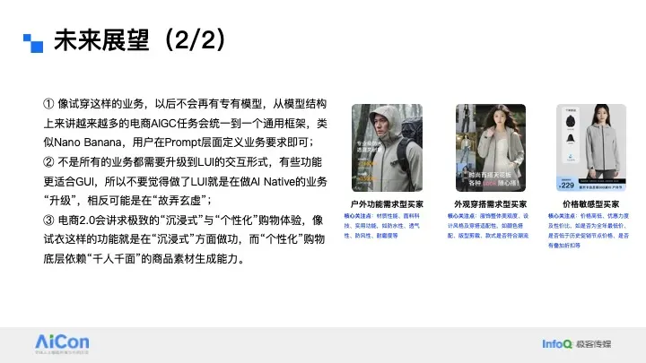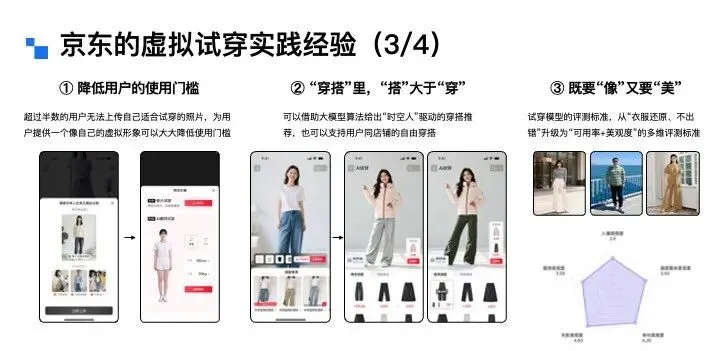 一是需全力降低用户使用门槛——我们有一组数据可以佐证这个观点,目前线上使用虚拟试穿的用户中,超过半数无法上传符合要求的试穿照片。即便我们在上传页面做了详细的规则引导,用户从相册里找到合规照片的难度依然很高。为此,我们果断加入了数字人模式,采用“真实照片上传+虚拟数字人形象”的双轨方案,用户如果找不到合适的照片,或者不愿上传个人照片,就可以输入身高、体重等参数打造专属数字人;若能提供肖像照,数字人会更贴近用户本人,没有肖像照也可以使用默认形象,这是降低用户使用门槛非常行之有效的方法。二是穿搭场景中,“搭”大于“穿”。正如之前提到的,“穿”是用户的基础性刚需,而“搭”属于突破性需求。但在电商场景下,用户对穿搭的期待其实很高,所以我们一直在积极探索为用户提供多样化的搭配可能性,以此挖掘更多产品价值。三是试穿效果要兼顾“像”与“美”,二者缺一不可。这一点往往被很多项目组忽略。用户对试穿效果的核心要求是“真、像、美”:“真”是衣服和人物的真实感,不能有明显的AI痕迹;“像”是人物ID、服饰细节、环境背景的精准保留;而“美”常常被忽视,但其实至关重要。我们在算法侧也把评测标准,从最开始的“衣服还原不出错”,升级为“可用率+美观度”的多维度评估体系。这里可以举个例子:大家做虚拟试穿,都是希望提升转化率、降低退货率,但如果忽略了“美”的需求,很可能连转化率都会受影响。没有试穿时,用户看商详主图觉得衣服不错就会下单,但AI试穿后发现效果不好看,反而会直接放弃购买。这其实是大模型在落地原生AI场景时会遇到的阵痛,所以我也呼吁行业同仁,面对这类问题要保持长期心态,用户心智的培养和行业的迭代,都需要一个过程 5.3 京东虚拟试穿未来探索方向