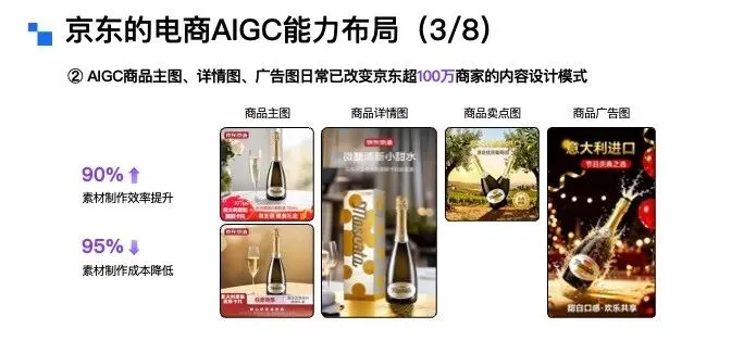第一个是商品素材 AIGC 生成。这里展示的是一款起泡酒的案例,覆盖商品主图、商详图、卖点图和广告图等全类型素材。目前这项能力已经改变了京东超 100 万商家的内容设计模式,既大幅提升了素材制作效率,又显著降低了制作成本。