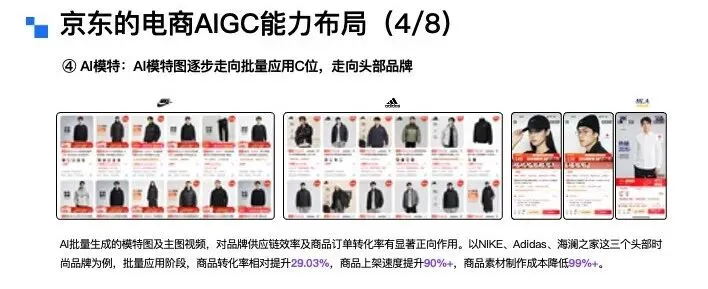 第二个是 AI 模特。模特图生成技术正逐步在头部品牌中批量落地,我们过去已与 Nike、阿迪达斯、海澜之家三大时尚品牌达成深度合作。在批量应用阶段,合作品牌的商品转化率提升 29%,商品上架速度提升 90%,同时商品素材制作成本大幅下降。大家现在在这些品牌店铺里看到的部分模特图,正是由我们的 AIGC 技术生成,再结合虚拟试穿能力完成服饰上身的。