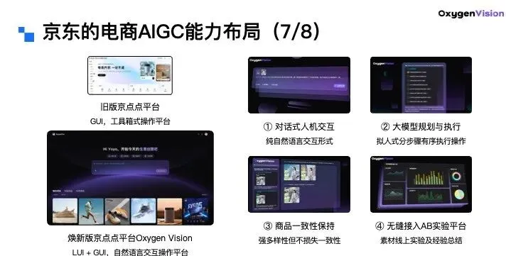 京东零售电商AIGC内容生成平台“京点点”整合了上述大部分能力,目前已支持超过30种业务场景(覆盖商品发品、运营、营销等环节),日能力调用量超1000万次,服务超100万京东商家,助力商家内容生产成本降低90%,生产效率提升95%。近期,京点点平台完成系统性升级,焕新版命名为Oxygen Vision平台。新版平台和老版最大的差别,一方面是集成了更多的AIGC能力项,另一方面则是把交互形式从原来的纯GUI交互,升级为Linguistic UI + GUI的混合模式。具体来说,新版平台具备四大核心特点:第一,对话式人机交互,支持纯自然语言的交互方式,操作更便捷;第二,大模型驱动的任务规划与执行,能够拟人式地分步骤、有序完成各项操作;第三,强一致性且不失多样性的商品素材生成能力,确保生成内容既贴合商品属性,又能满足多样化需求;第四,无缝接入京东AB实验平台的能力。正如我们之前所说,一个合格的B端AIGC内容生成平台,必须打通“素材生产—投放—实验回收—模型迭代”的完整闭环,而这一点,新版京点点平台已经完全具备。一,从技术角度来看,像虚拟试穿这类垂直业务,未来不会再依赖专属定制模型。一个明确的技术趋势是,越来越多的电商AIGC任务,会统一到通用大模型框架之下,就像nano banana pro这类架构一样,用户只需要在prompt层面定义好业务需求,就能完成相应任务。只不过现在还有不少虚拟试穿方案,还停留在定制化思路上,这个转变需要一个过程。第二,想和所有AIGC创业者、以及大厂里做AI提效的同学聊一句:不是所有业务都需要升级到LUI(对话式交互)的形式。有些功能用GUI(图形界面)来承载,体验反而会更好。不要觉得套上LUI的壳,就是做了AI native的升级,很多时候这种做法反而属于“故弄玄虚”。这两年大家应该也见过不少“AI小助手”“智能XX工具”,本质上就是把原来的GUI功能强行改成对话式,看似用上了大模型和Agent,实际体验反而不如从前。尤其是编辑类需求,图形化的交互方式往往更直接高效。而新京点点平台之所以选择LUI+GUI的混合模式,核心是看服务对象,我们主要服务的是京东的采销同学。他们每个人负责的SKU数量极多,不可能针对每个商品去定制化制作素材,更需要“一句话指令”就能自动生成内容的傻瓜式操作。这样才能让采销把精力聚焦在拿货、议价、仓储运营这些核心工作上,而不是耗费在素材制作上。第三,关于电商2.0核心方向,极致的沉浸式与个性化购物体验是核心目标。虚拟试穿是沉浸式体验的重要探索,而个性化购物的底层支撑是“千人千面”的商品素材生成能力。这也是京东在探索大模型时代电商2.0形态的一条核心技术路线。大家对“千人千面”并不陌生,过去京东零售的搜索推荐就是如此,同样搜索一个关键词,不同用户看到的结果页截然不同。但到了商品素材层面,目前商品素材仍处于“千人一面”状态,商家只维护了一套主图、商详图和卖点介绍。而“千人千面”的商品素材生成,就是要打破这种单一性。比如:一款中性款冲锋衣,面对三类不同需求的买家,可以用算法提炼出他们各自关注的核心卖点,定制差异化的素材,既精准吸引用户,又提升购物体验。第一类是户外功能型买家,他们最关心面料科技、防风防水、透气耐磨这些专业指标,AI就在商品图上重点呈现这些性能参数;第二类是外观穿搭型买家,他们不纠结材质,只在意设计风格、版型潮流和穿搭适配,AI就主打OOTD相关的素材生成,突出颜值和搭配感;第三类是价格敏感型买家,他们不关注功能和颜值,只看价格、优惠和赠品,AI就直接在图片贴片上展示最低价标识、优惠券、赠品信息等内容,实现精准引流与体验提升。