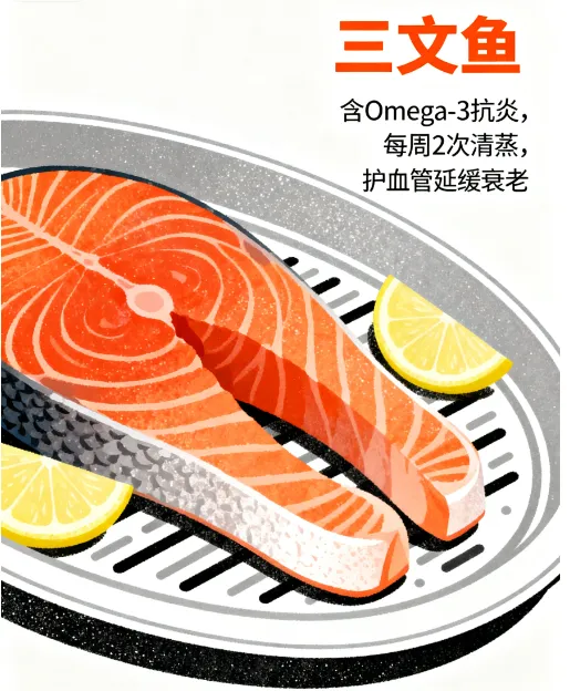 三文鱼:含 Omega-3 抗炎,每周 2 次清蒸,护血管延缓衰老。