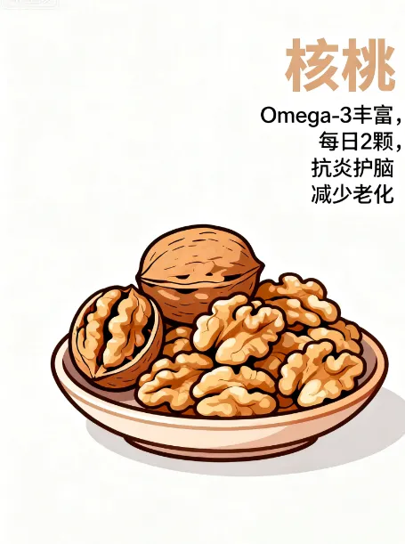核桃:Omega-3 丰富,每日 2 颗,抗炎护脑减少老化。