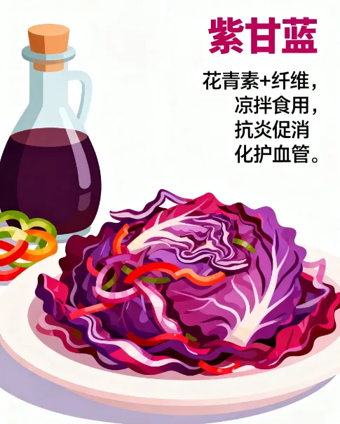 紫甘蓝:花青素 + 纤维,凉拌食用,抗炎促消化护血管。