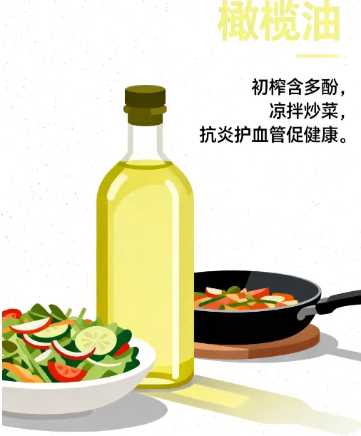 橄榄油:初榨含多酚,凉拌炒菜,抗炎护血管促健康。