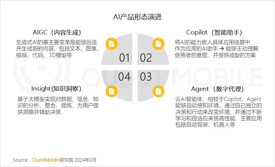 5、AI产品形态正朝着内容生成、知识洞察、智能助手以及数字代理等方向发展演变,本报告后续将重点在AIGC产品领域展开进一步的深入探讨。