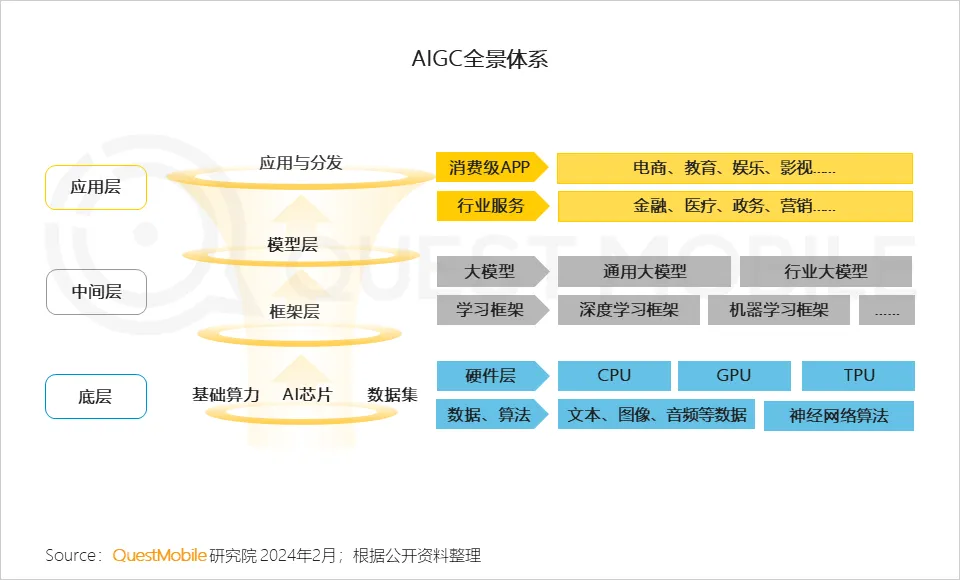 7、AIGC体系的结构可以被细致地划分为三个层次,其中底层主要是指算力支撑部分,它为整个体系提供了坚实的基础保障;而中间层则涵盖了模型和框架等关键组成部分,这些部分的技术水平和成熟度直接决定了AIGC体系的核心能力。在此背景下,应用层得以持续拓展其覆盖范围,不仅满足了现有行业的需求,还不断探索并进入新的领域,从而实现了行业边界的持续拓宽与延伸,为整个AIGC生态系统的繁荣注入了强大的活力。
