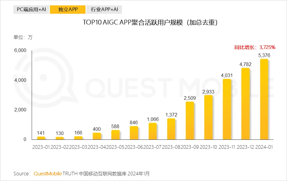 根据统计数据显示,2024年1月,TOP10 AIGC应用聚合活跃用户规模已达5,376万,较去年同期增长3,725%。