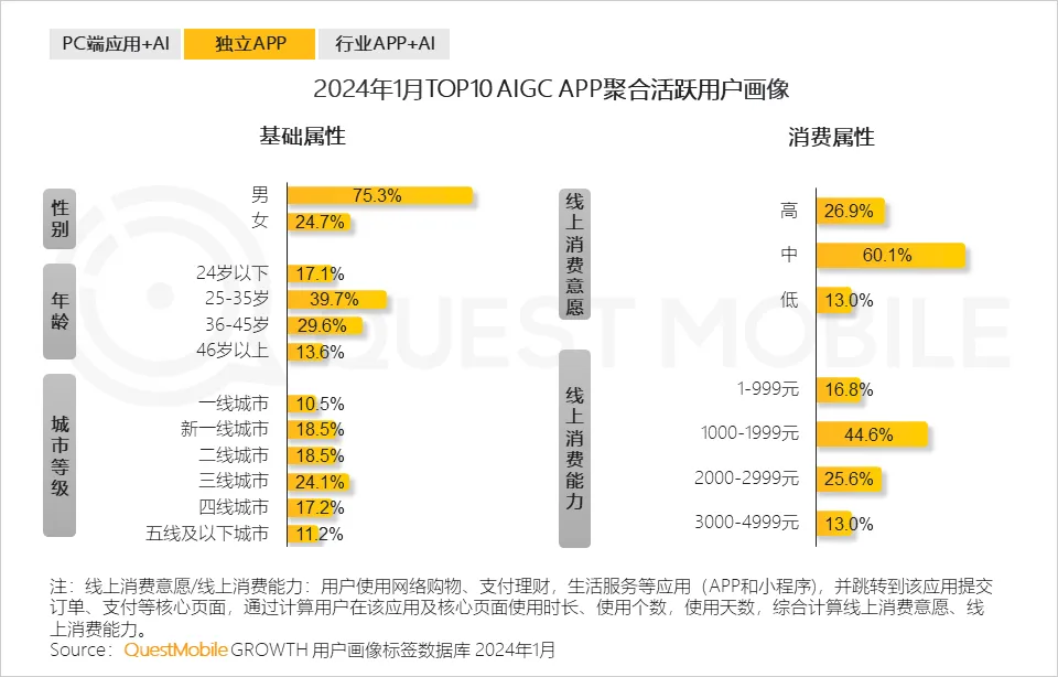 5、在用户属性方面,头部AIGC APP的聚合用户群体以男性为主,年龄结构集中在25至35岁之间,主要分布于三线及以上城市;该用户群体普遍呈现出较高的消费意愿与消费能力。