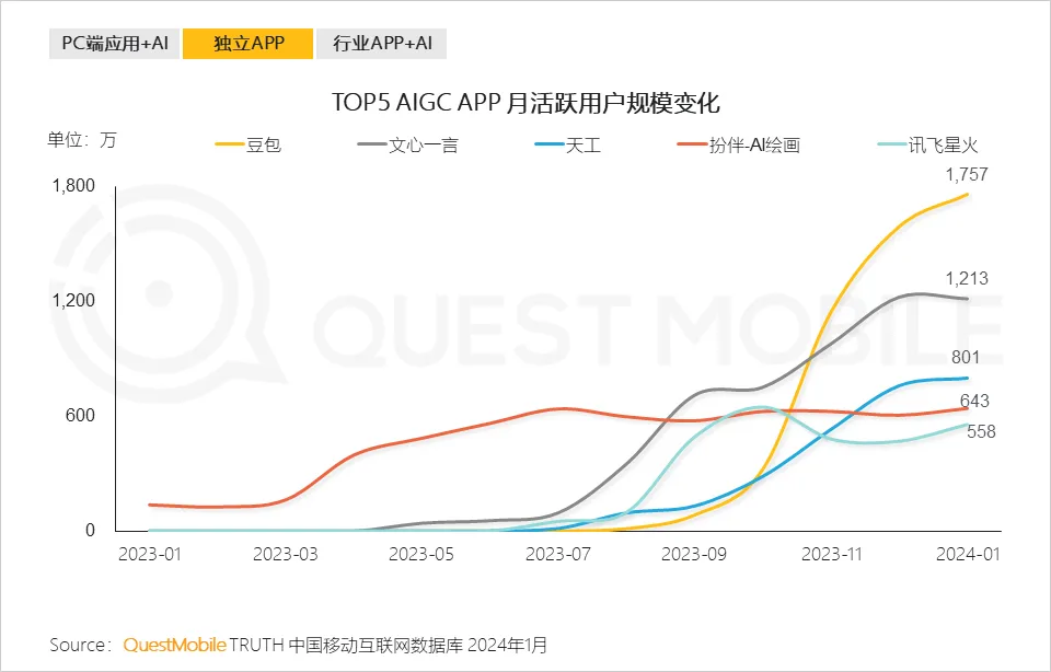 二、AIGC多模态应用覆盖PC及移动端平台,头部应用程序注册用户量突破5000万。