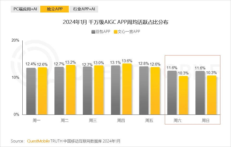 9、AIGC APP在工作日(周一至周五)期间的活跃度高于休息日(周六、周日),推测现阶段AIGC APP与办公场景的适配性更强