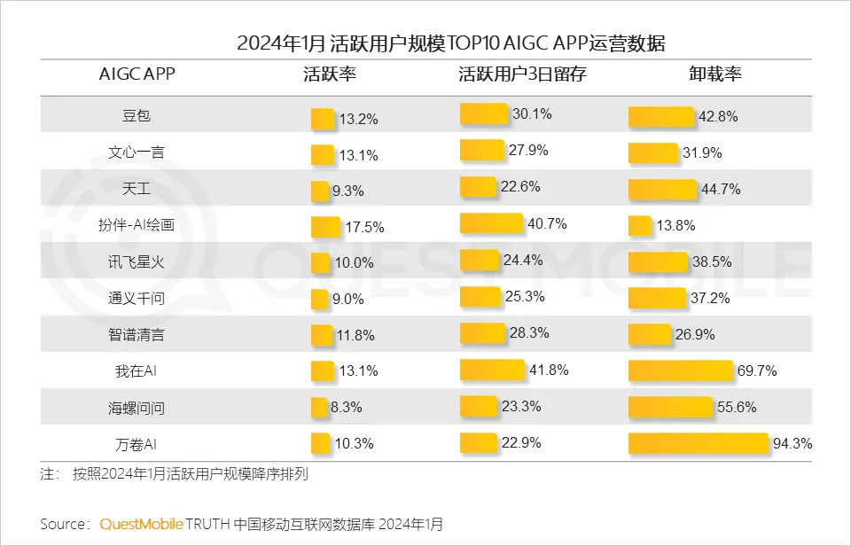 2、头部AIGC APP运营数据:活跃率低,均在20%以下;忠诚度方面,3日留存均在50%以下;流失风险高,部分APP的卸载率在50%以上