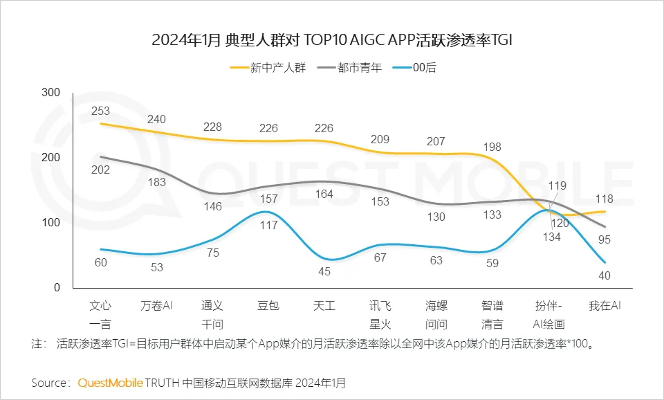 3、不同类型人群对头部AIGC APP的偏好有着明显的差异;TGI方面,新中产人群对TOP10应用的使用偏好较高,00后人群则只偏好豆包与扮伴-AI绘画